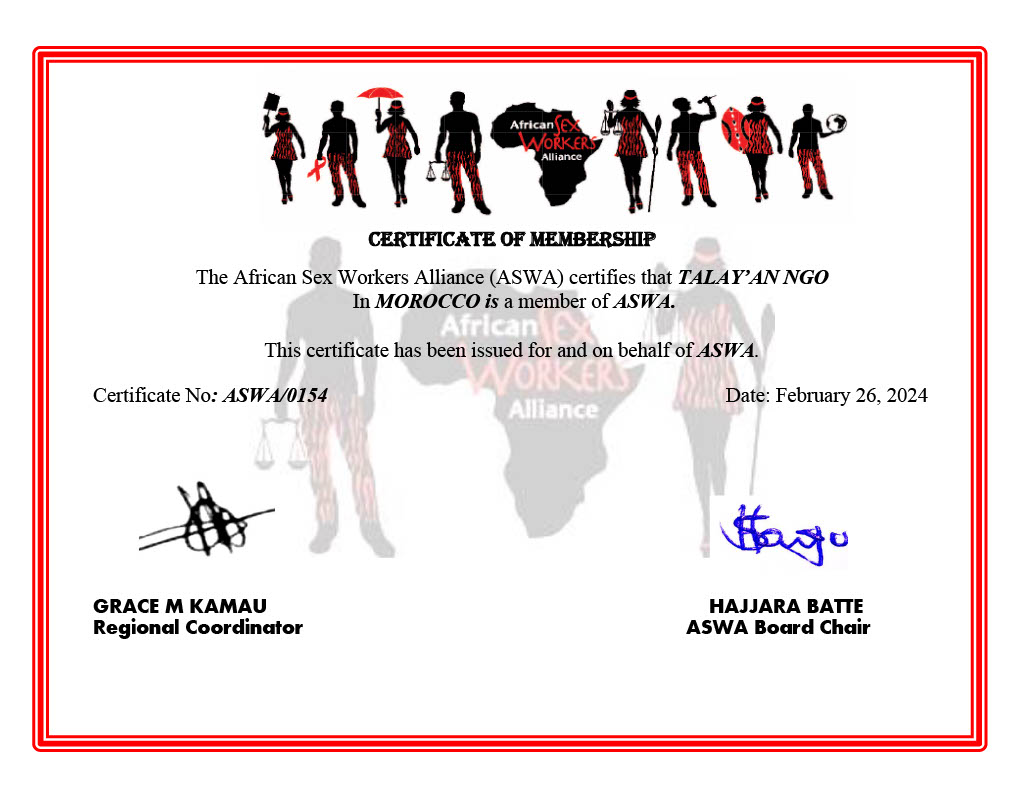 Exciting News! 🌟 TALAY’AN the first and only sex worker led organization that working explicitly on visibly promoting sex worker rights in Morocco and North Africa is now an official member of ASWA, the African Sex Workers Alliance! 🎉 We’re proud to join forces with ASWA to advocate for sex worker rights in our MENA region. towards a future where sex work is fully decriminalized in AFRICA . Join us in celebrating this milestone! ✊🏽❤️ #SexWorkerRights #ASWA #MENA #Empowerment